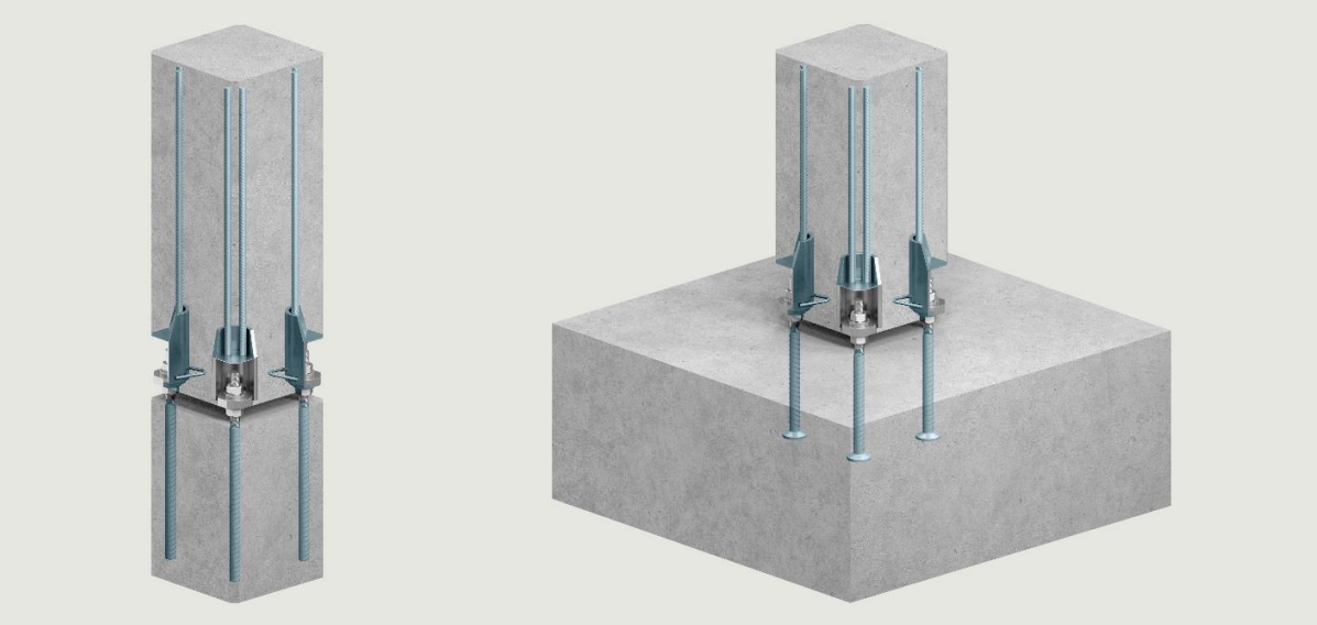 The connection consists of a prefabricated shoe that is installed in the element formwork before casting. The shoe connection is in working order when its grouting concrete has reached the design strength. Shoe connection design is made easy and fast with A-COLUMN® design software. The bolts used for the shoes are ATP and AHP® rebar bolts.