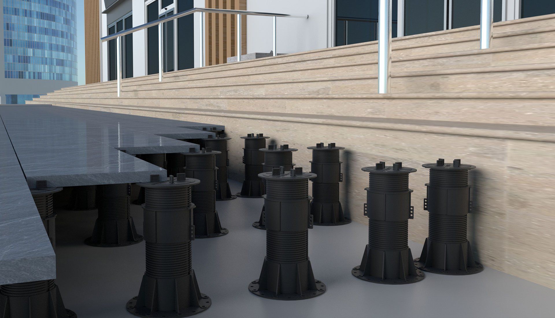 A flexible adjustable paving pedestal system designed for heights between 18mm to 1083mm. The adjustable system has different
