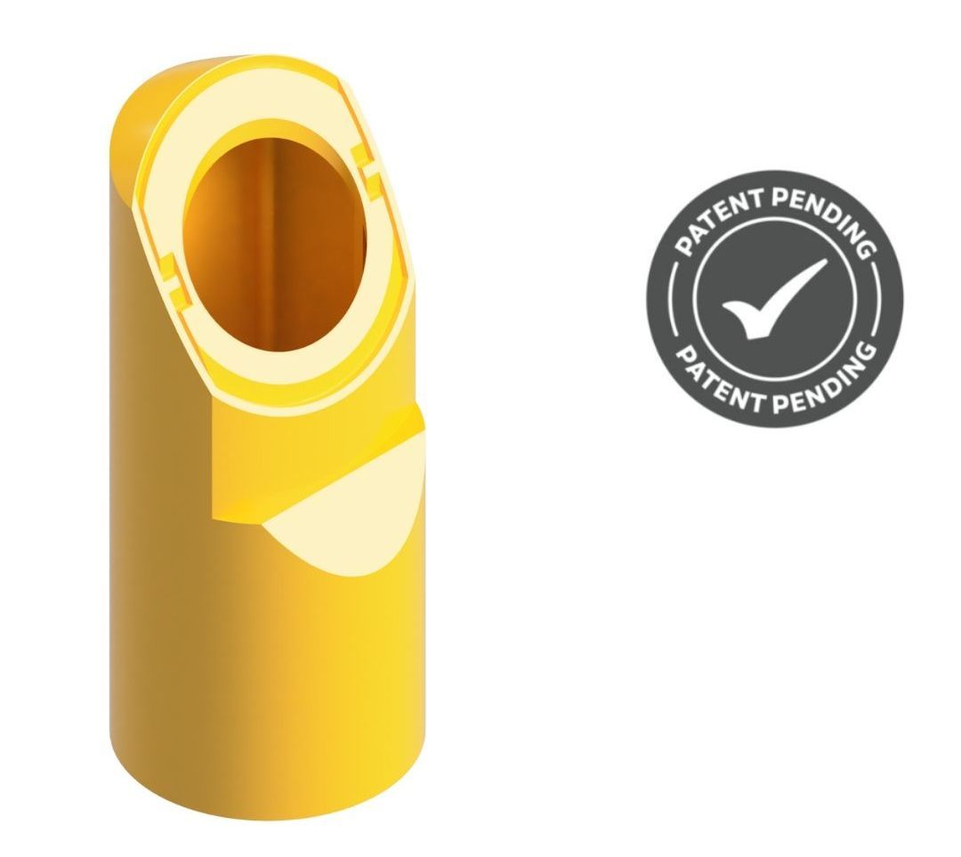 The 30° Formwork Connector provides a connection to the Flexible Grout Tube and the Formwork Holding Plate. The unique acute angle of the chamfered face provides a convenient entry point to administer grouting compounds that does not inhibit flow and allows expelled air to escape more readily, improving grout flow and reducing the likelihood of voids in the